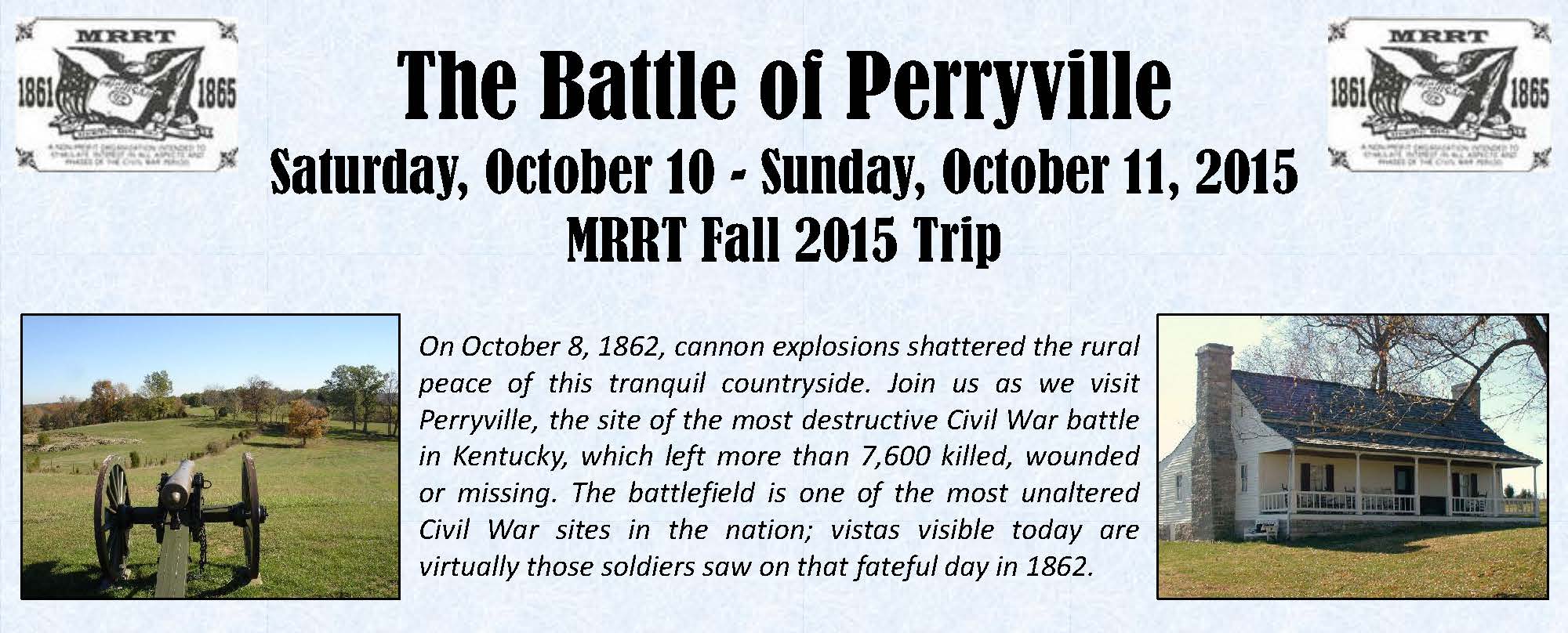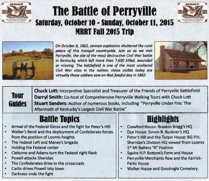 For 2015, the MRRT traveled from October 10-11 to Perryville, the site of the most destructive Civil War battle in Kentucky, which left more than 7,600 killed, wounded or missing. We have recorded the highlights of our 2015 Trip in this slideshow.